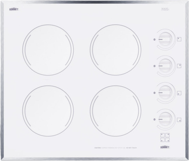The CR424WH is a 220V cooktop featuring four 1200W burners made by E.G.O. in Germany. The smooth white ceramic glass surface is constructed from Schott Ceran for long-lasting durability, easy cleanup, and sleek kitchen style. An elegant trim in 304 grade stainless steel completes the look.